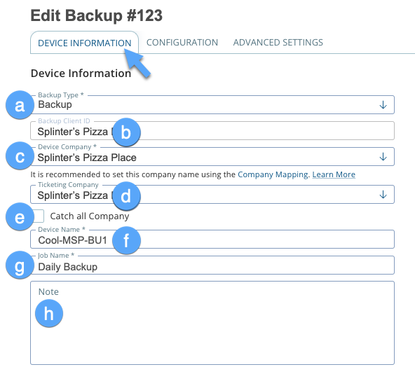 In this article, each setting is organized by the Device Information, Configuration, and Advanced Settings tabs and broken down into the following three categories to align with how you activate and edit your backups: